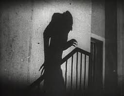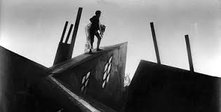 Cartel de cine homenajeando a las películas clásicas del Expresionismo alemán "El gabinete del doctor Caligari" y "Nosferatu" y también guiños de típico cartel de cine antiguo, incluyendo breves críticas inventadas por mí.